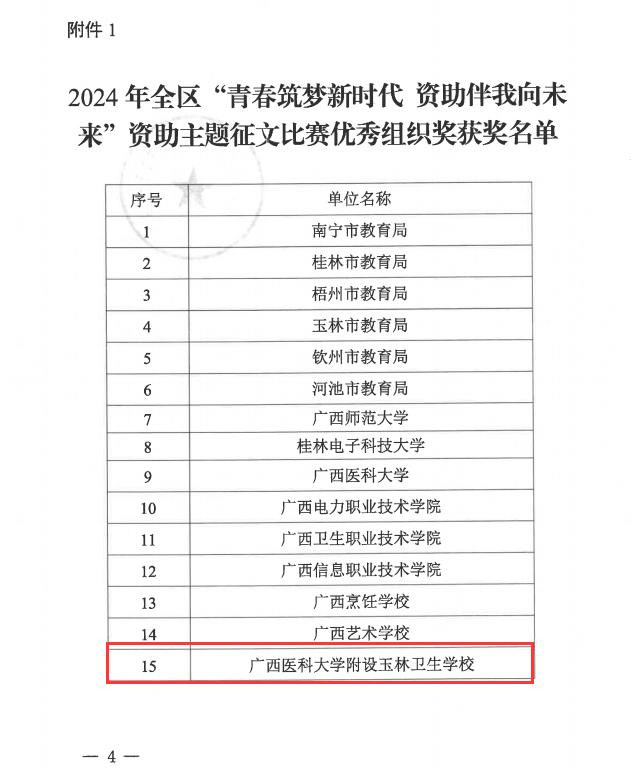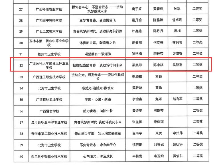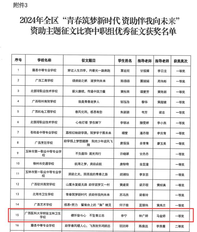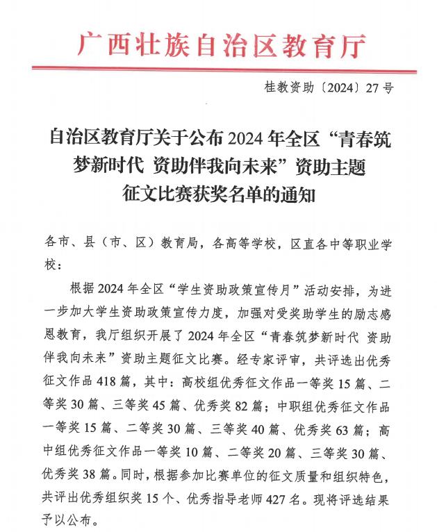 近日,广西壮族自治区教育厅发布的《自治区教育厅关于公布2024年全区“青春筑梦新时代 资助伴我向未来”资助主题征文比赛获奖名单的通知》(桂教资助[2024]27号),我校荣获“优秀组织奖”,李宁同学《襟怀奋斗心 不坠青云志》荣获中职组一等奖,梁奥菲同学《挺膺担当励青春 资助笃行向未来》荣获中职组二等奖,林广婷老师、马金娇老师、陈中棋老师,吴智富老师分别获评优秀指导老师奖。