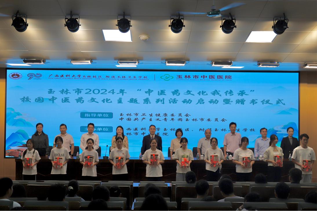 在喜迎广西医科大学建校九十周年校庆之际,为进一步弘扬中华民族传统文化,丰富中医药文化教育,将书香与药香碰撞,传承与创新融合,11月12日上午,玉林校区、附设玉林卫生学校联合玉林市中医医院在玉林校区举办“中医药文化我传承”校园中医药文化主题系列活动。玉林市卫生健康委副主任杨媚,玉林市中医医院党委书记姚光、院长刘宇河、工会主席曾家丽,共青团玉林市委员会学少部部长、办公室负责人李钟玉,玉林校区、附设玉林卫生学校在家领导班子成员及师生代表近400人参加活动。启动暨赠书仪式由玉林校区、附设玉林卫生学校校长赵婷婷主持。