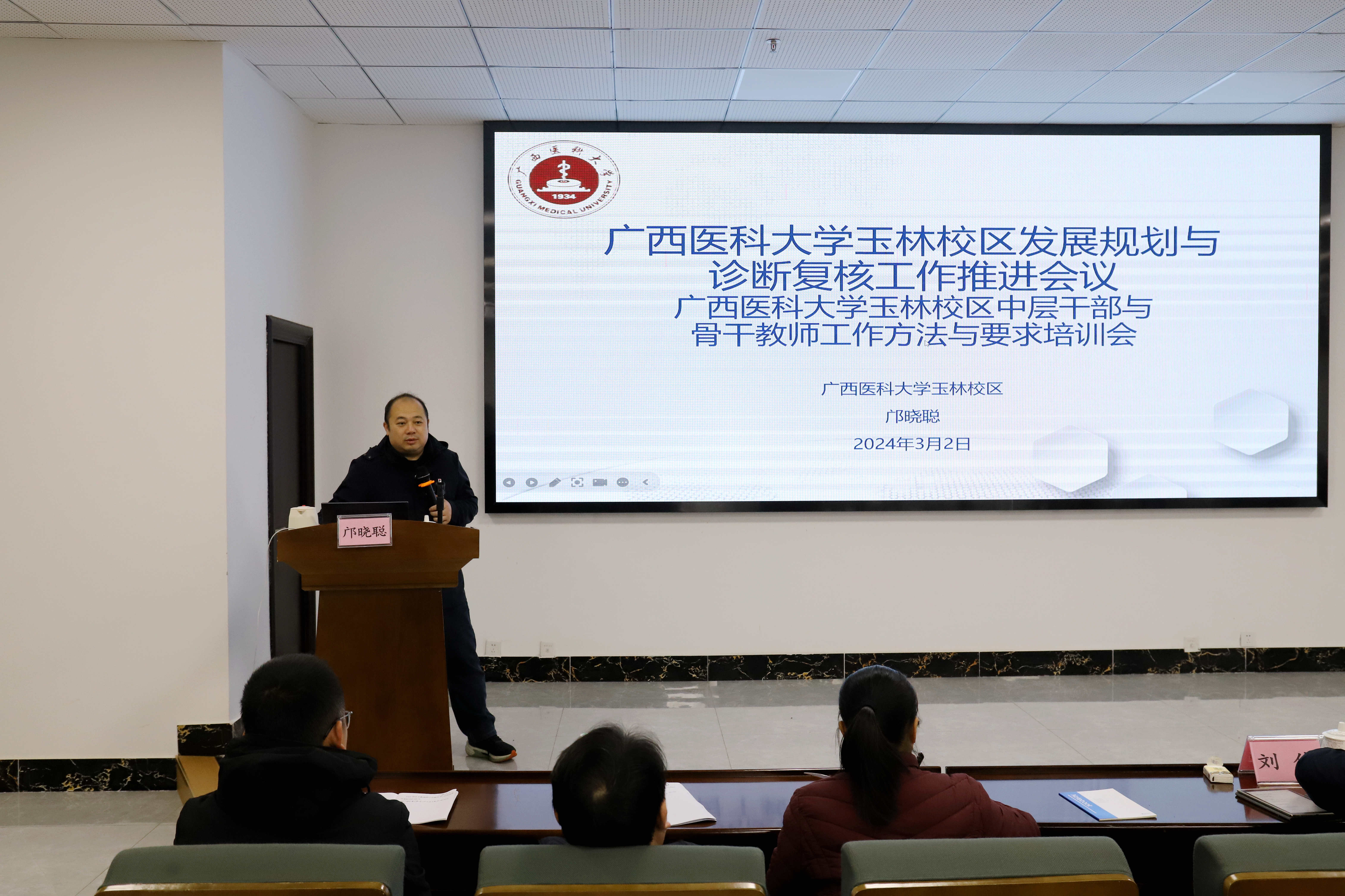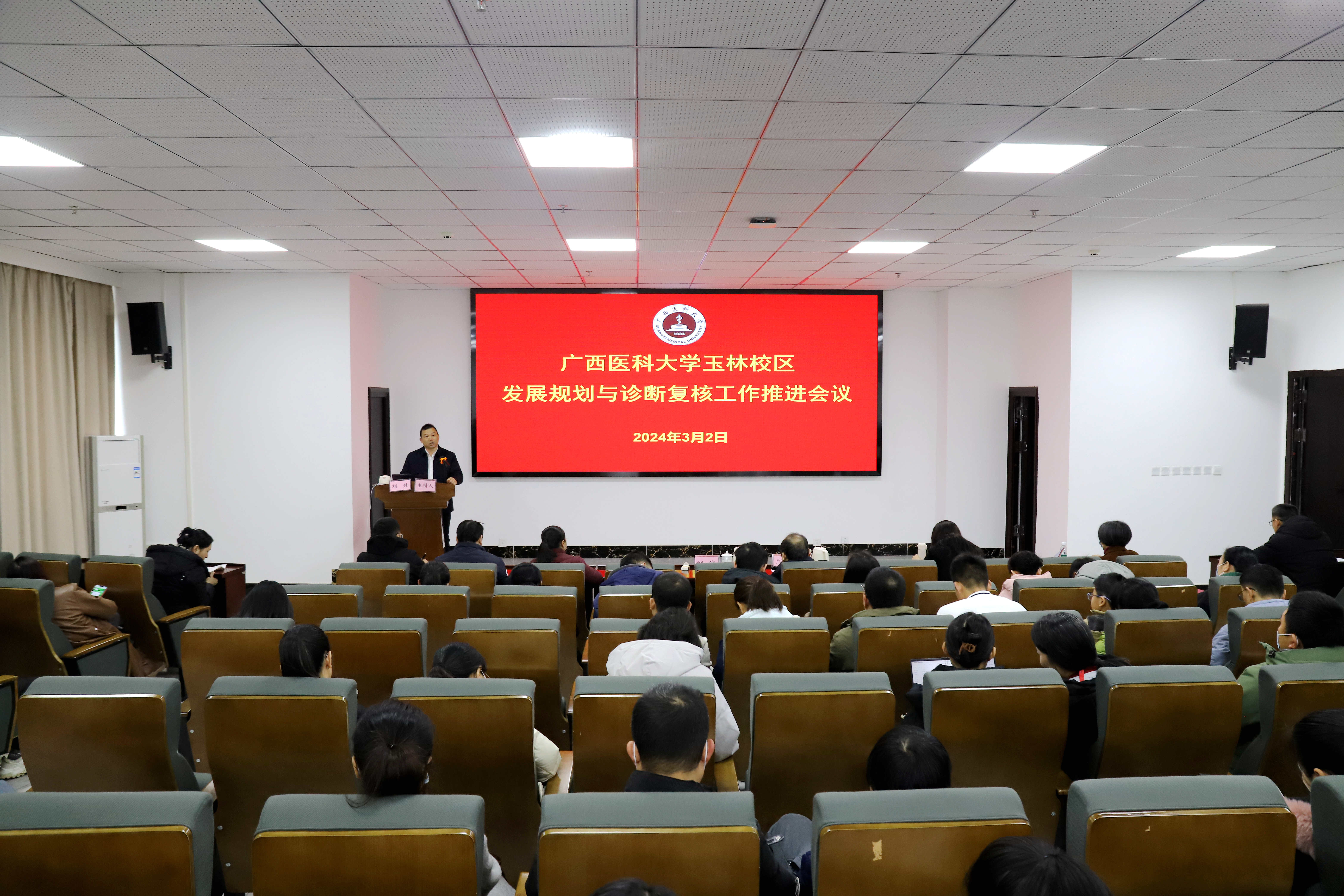 为加快玉林校区高质量发展步伐,提高工作质量和工作效率,3月2日下午,玉林校区在18号综合楼一楼报告厅召开2024年广西医科大学玉林校区发展规划与诊断复核工作推进会议。玉林校区、附设玉林卫生学校校长邝晓聪出席,全体中层干部、各学部骨干教师参加会议,会议由玉林校区、附设玉林卫生学校副校长刘伟主持。