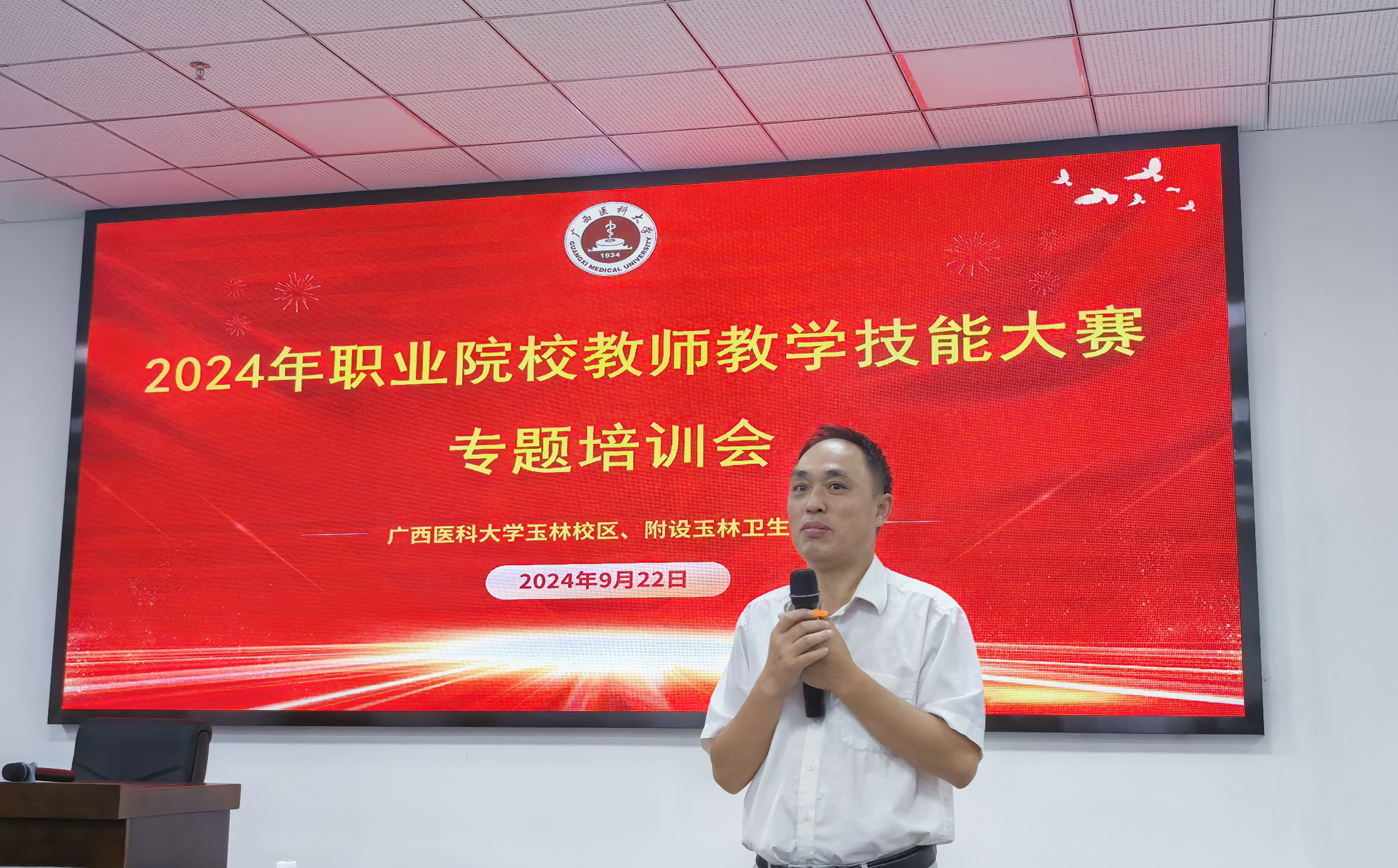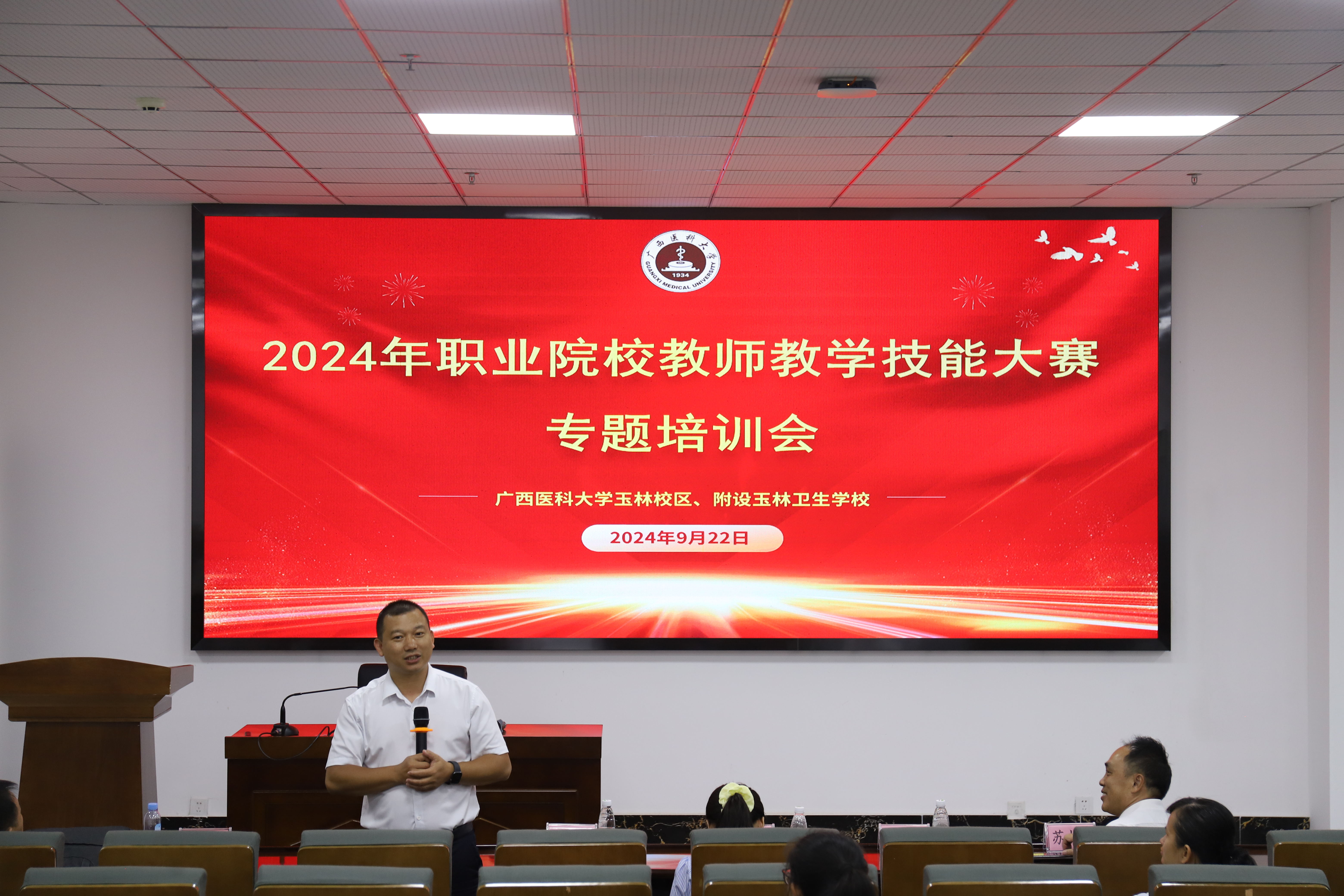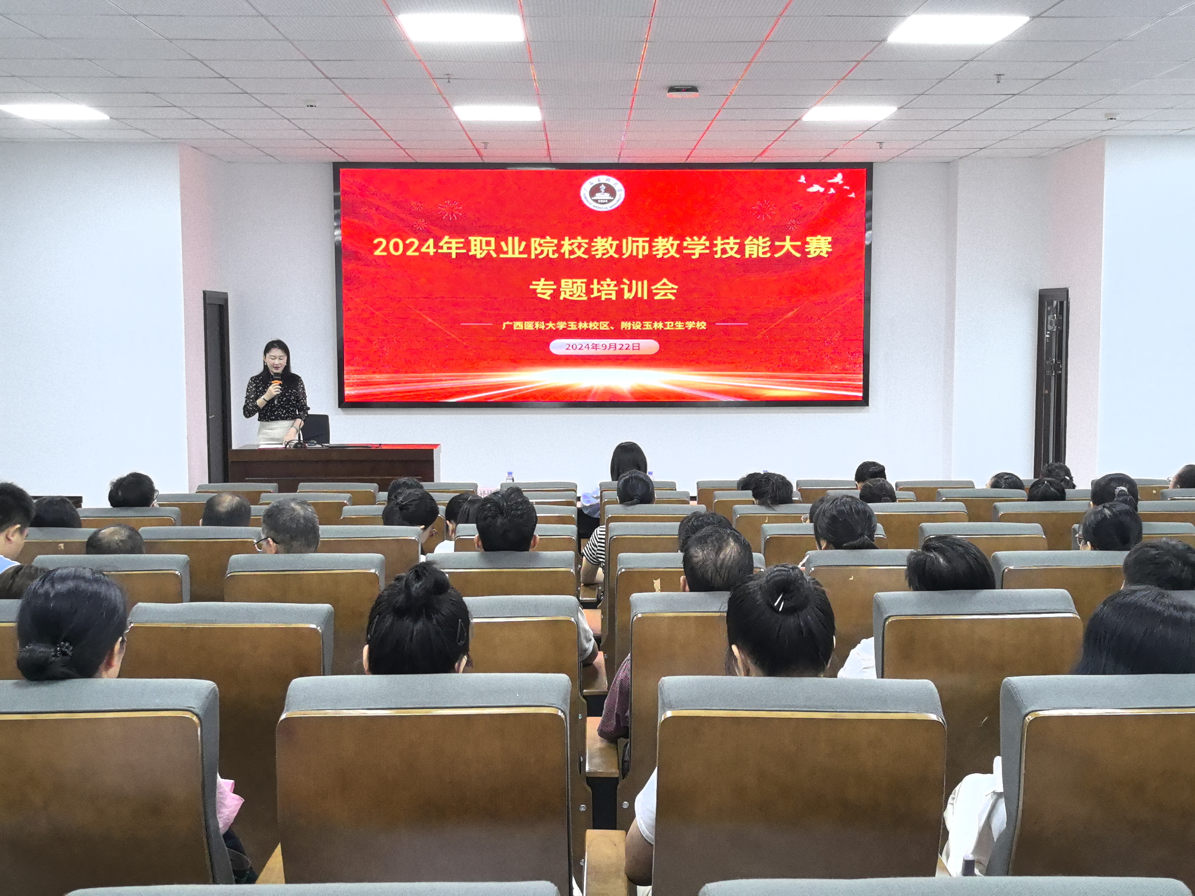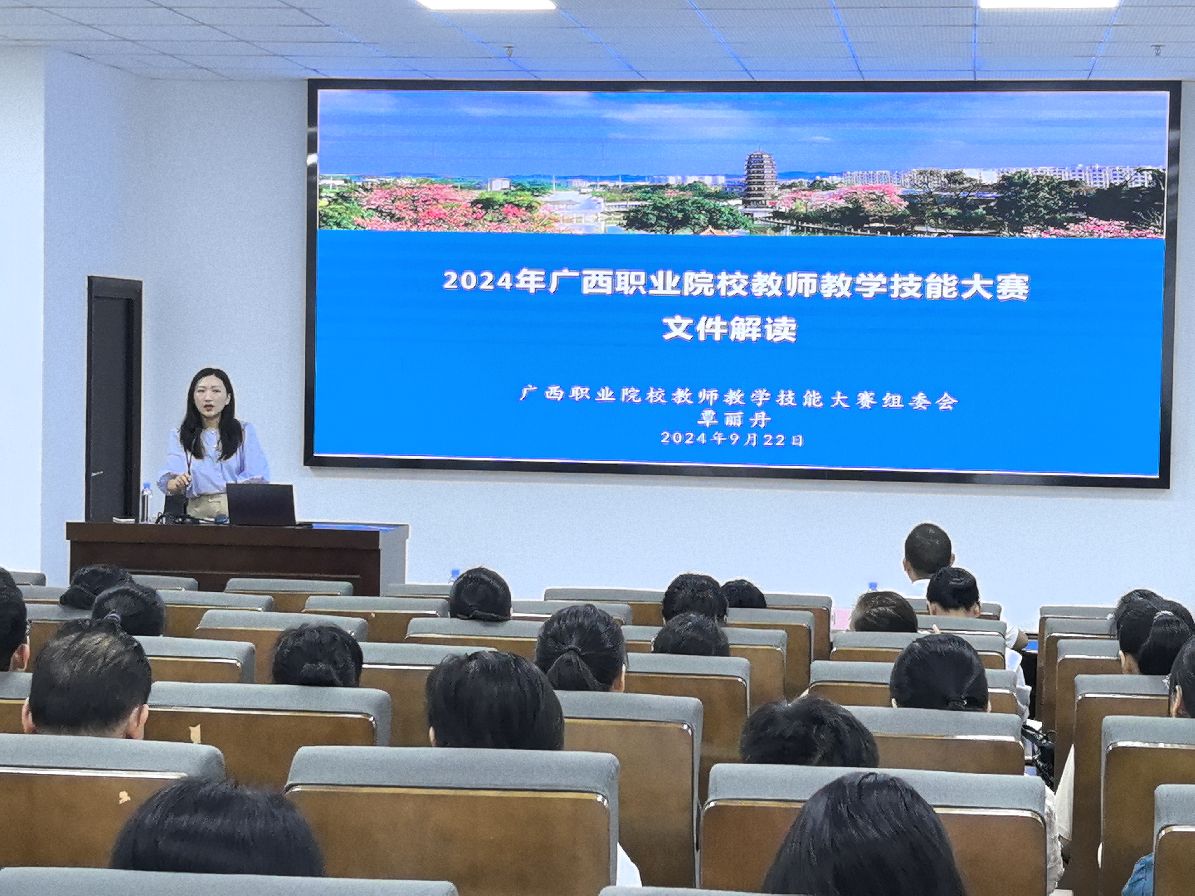 为深化新时代教师队伍发展,推进职业教育教学改革,提升教师教育教学能力,提高教学质量,培育“双优计划”标志性成果,9月22日,玉林校区在18号楼一楼报告厅举办2024年秋季学期教师教学技能大赛专题培训会。本次培训会由刘伟副校长主持,特别邀请到广西职业技术学院敖茂尧教授、覃丽丹老师作为主讲嘉宾,为玉林校区教师作精彩纷呈的专题讲座和备赛指导。