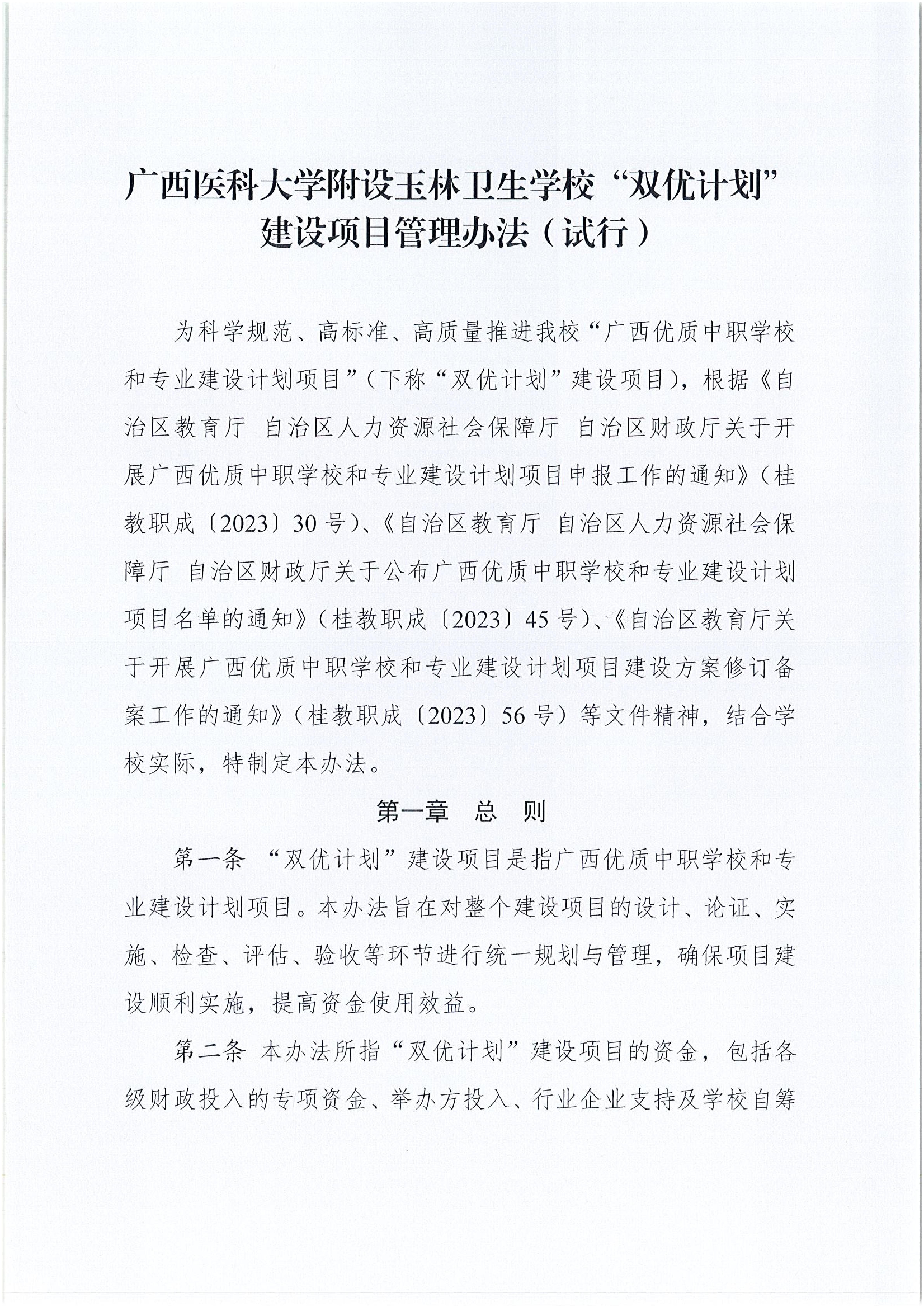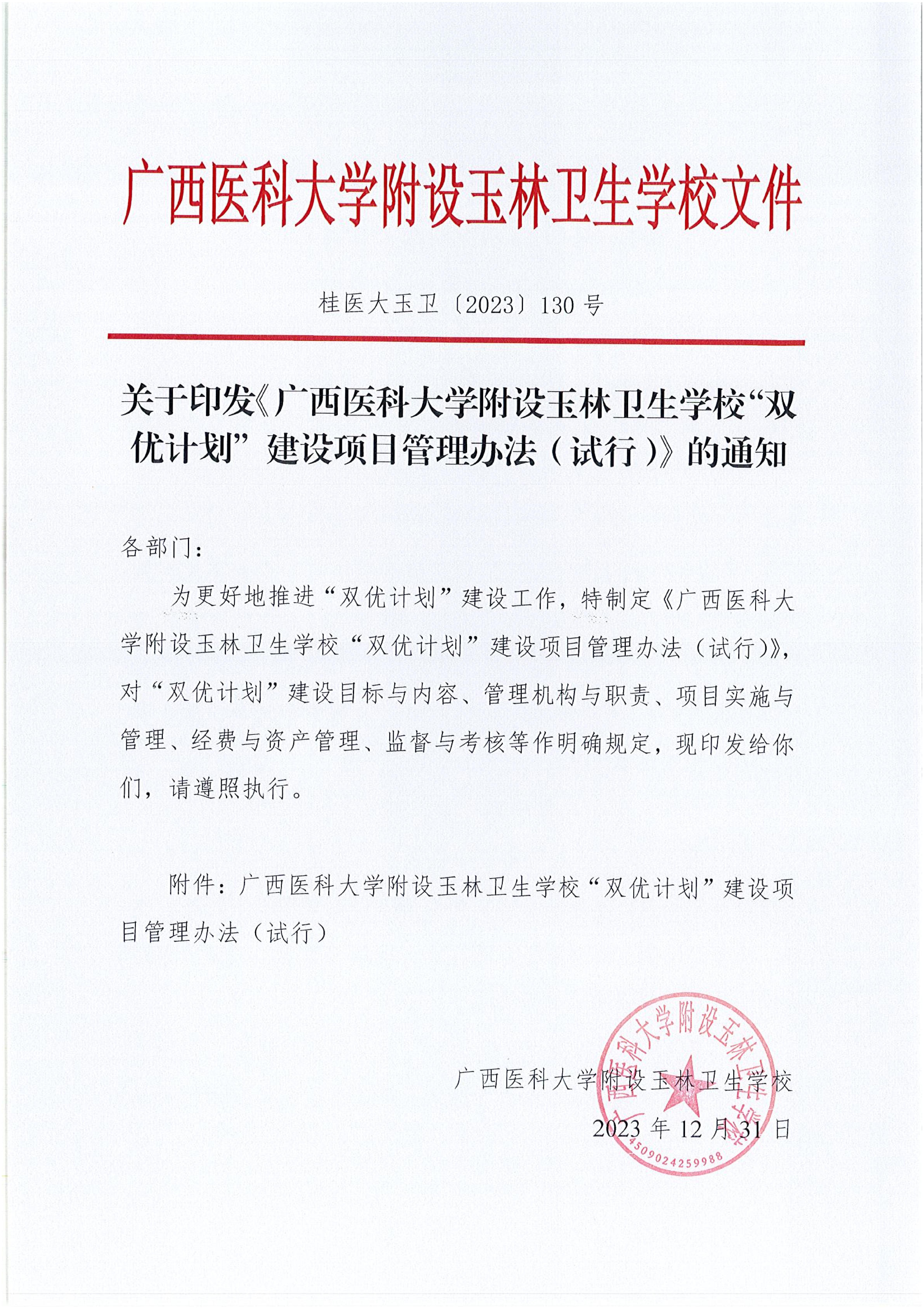桂医大玉卫〔2023〕130号 关于印发《广西医科大学附设玉林卫生学校“双优计划”建设项目管理办法(试行)》的通知