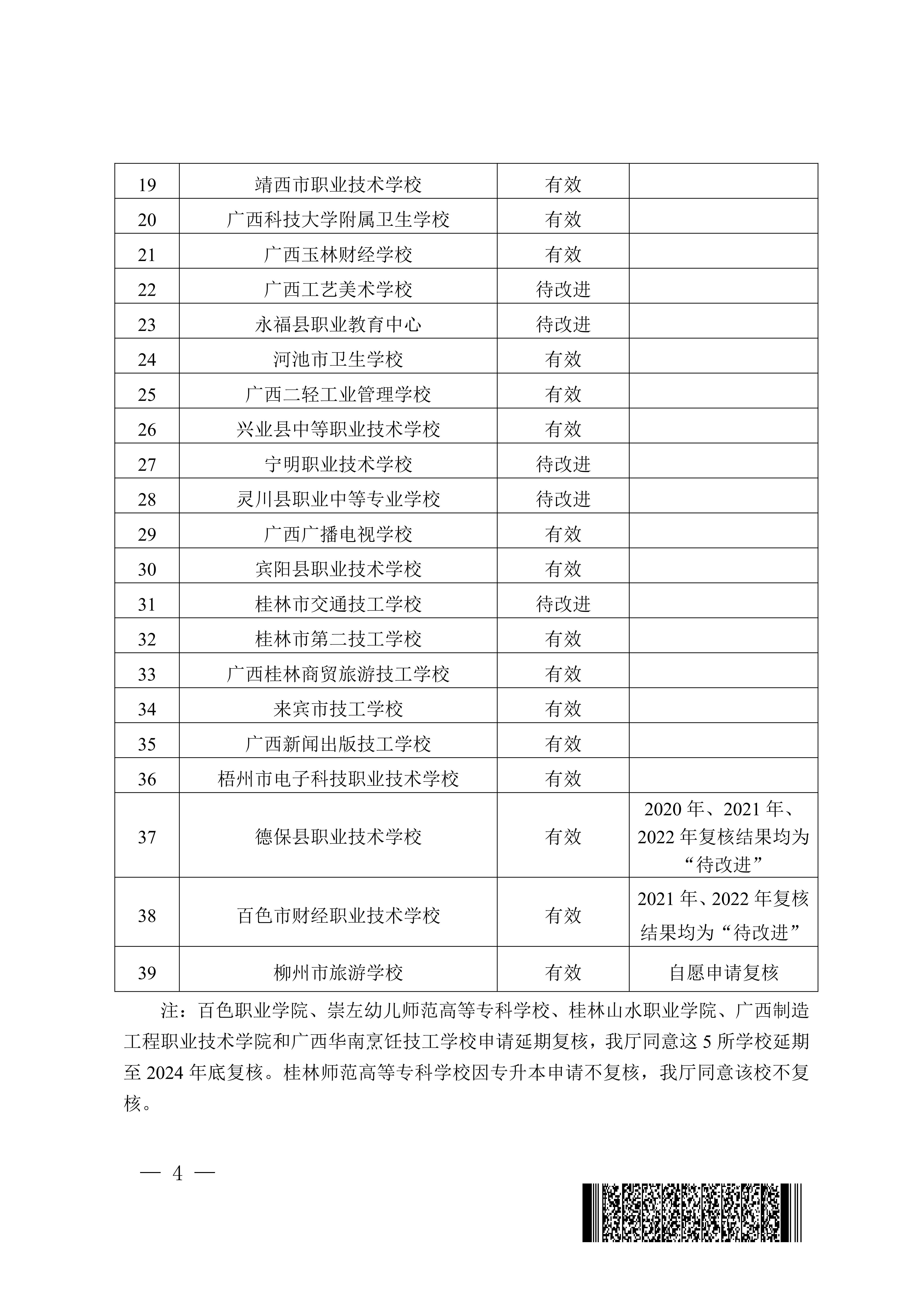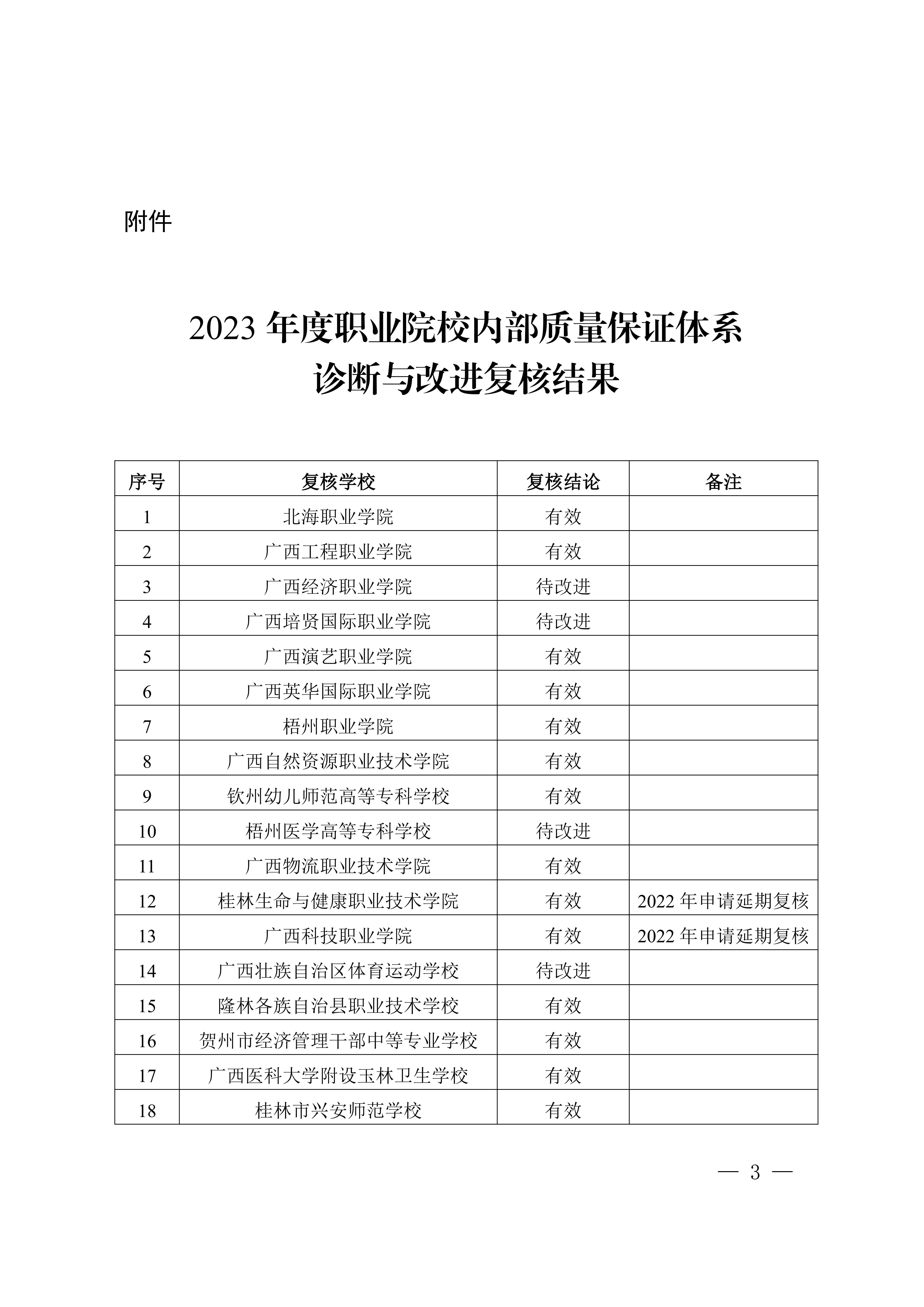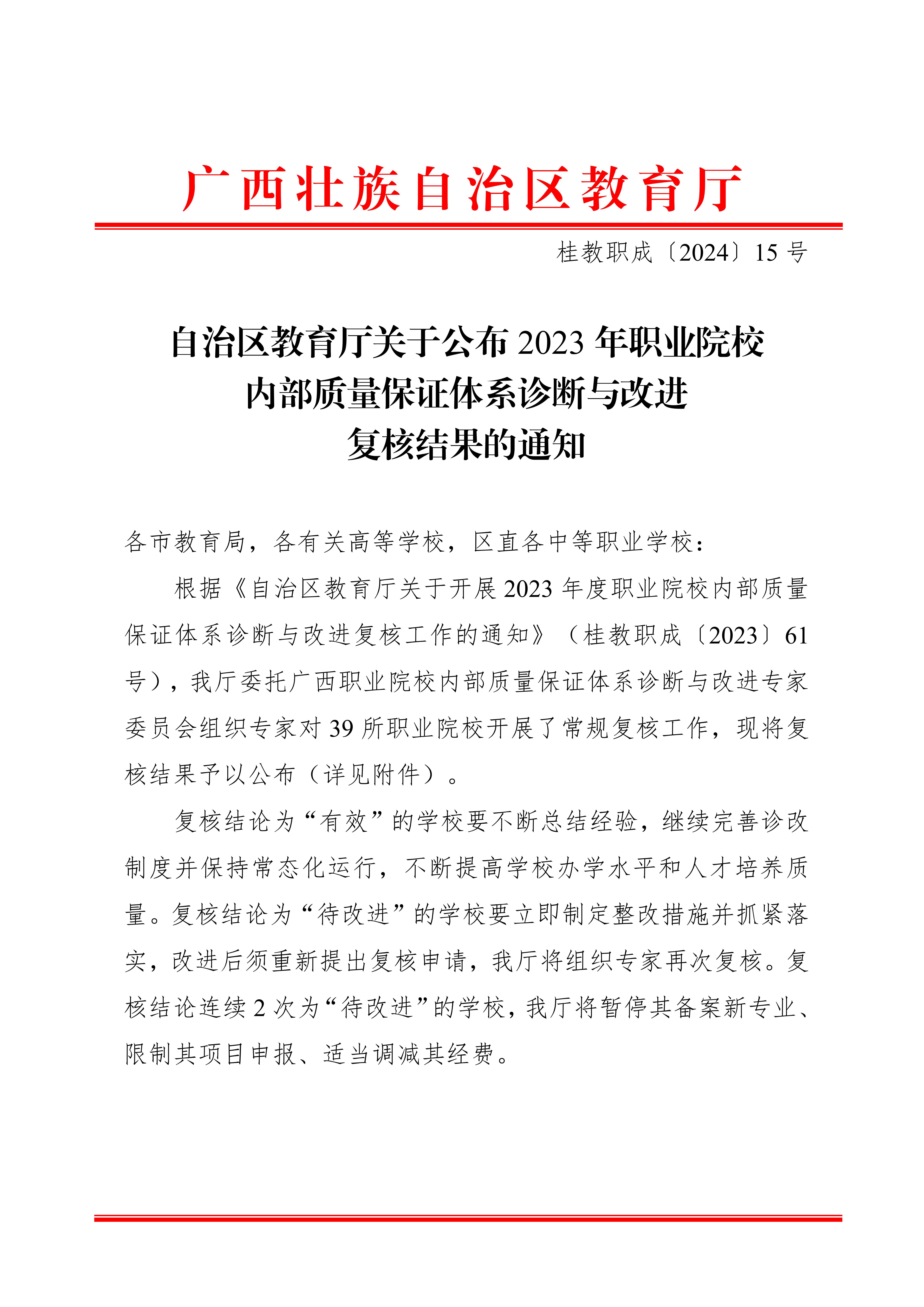 桂教职成〔2024〕15号自治区教育厅关于公布2023年职业院校内部质量保证体系诊断与改进复核结果的通知