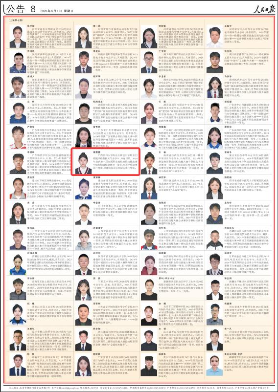 5月4日,五四青年节之际,《人民日报》专版刊登《2023—2024学年度中等职业教育国家奖学金获奖学生代表名录》,从全国约2万名荣获2023—2024学年度中等职业教育国家奖学金中职学生中,遴选并展示了100名优秀代表的事迹风采。广西医科大学附设玉林卫生学校2022级医学检验技术专业学生萧露露光荣入选上榜。