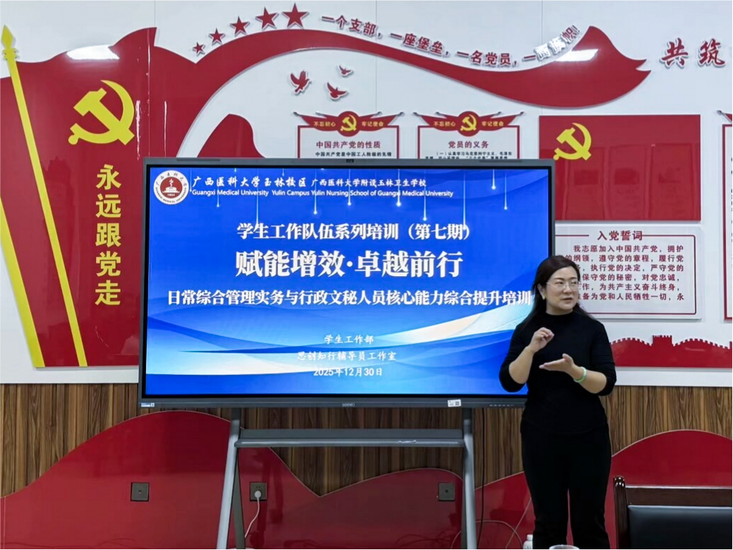 为提升学生工作队伍业务能力与规范化水平,12月30日,玉林校区学生工作部组织开展第七期学生工作队伍系列培训。本次培训以“赋能增效 卓越前行—日常综合管理实务与行政文秘人员核心能力综合提升培训”为主题,由玉林校区、附设玉林卫生学校党委副书记李云凤主讲,学工部、团委与招就办全体成员参与。