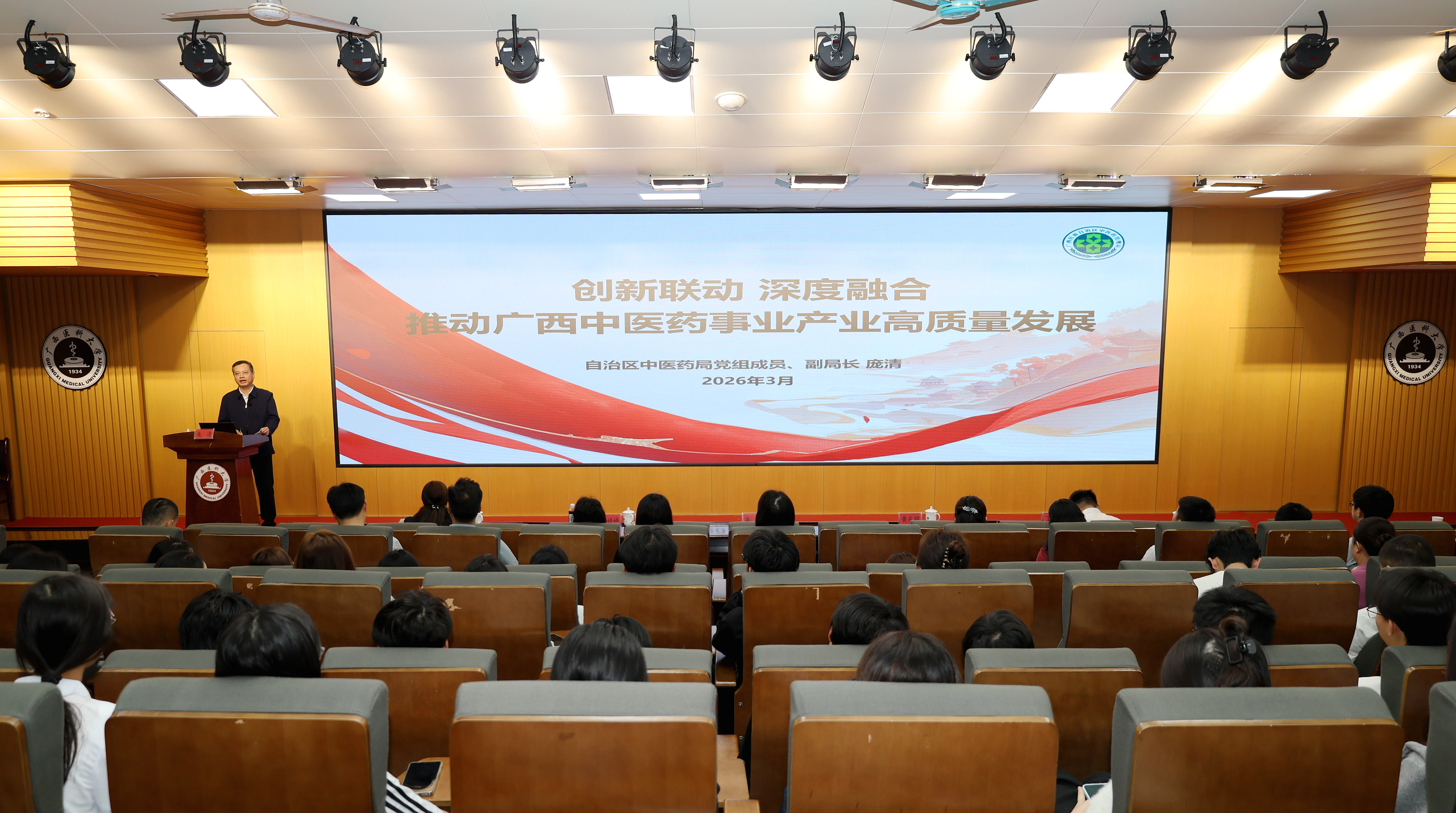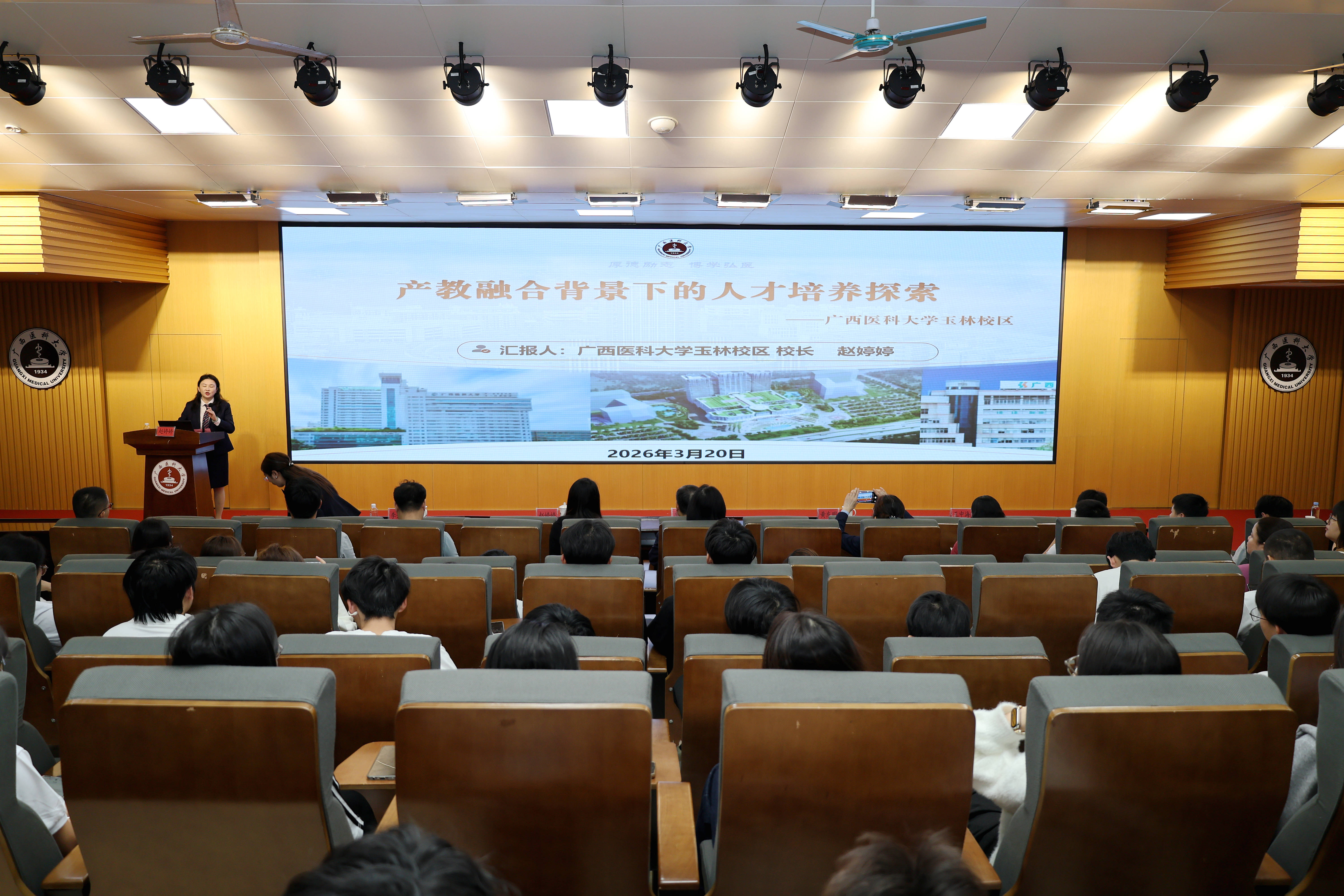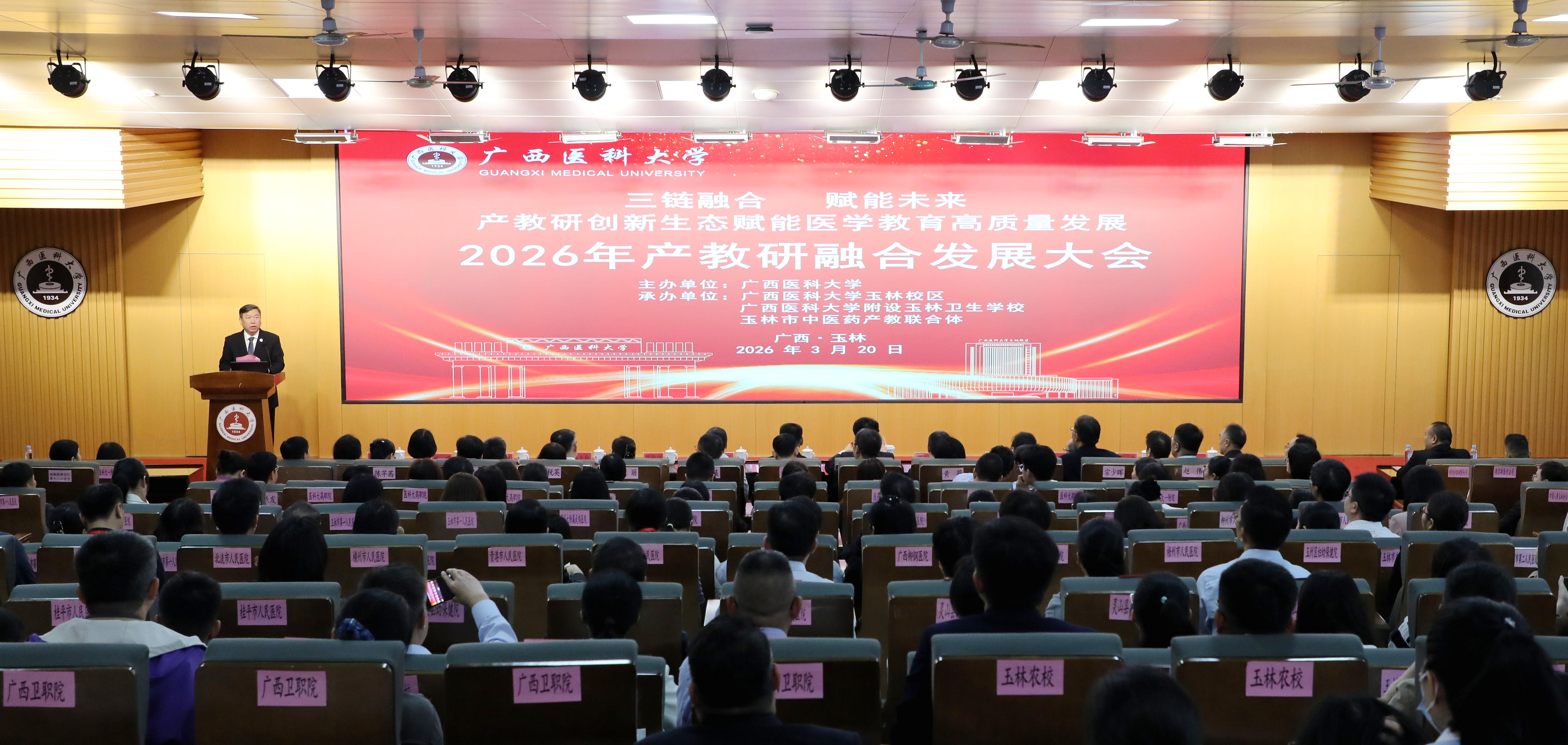3月20日,广西医科大学2026年产教研融合发展大会在我校玉林校区6号楼一楼报告厅隆重召开。学校党委书记陈川、校长曾志羽,玉林市委常委、统战部部长、副市长范小花出席,自治区、玉林市相关部门负责人,玉林校区战略合作医院、实习单位、就业单位,玉林市中医药产教联合体成员单位,全区医药卫生类高校、中职学校的领导、嘉宾,以及我校各附属医院、教学医院、相关职能部门代表及师生代表参会。学校副校长陈俊强主持开幕式。