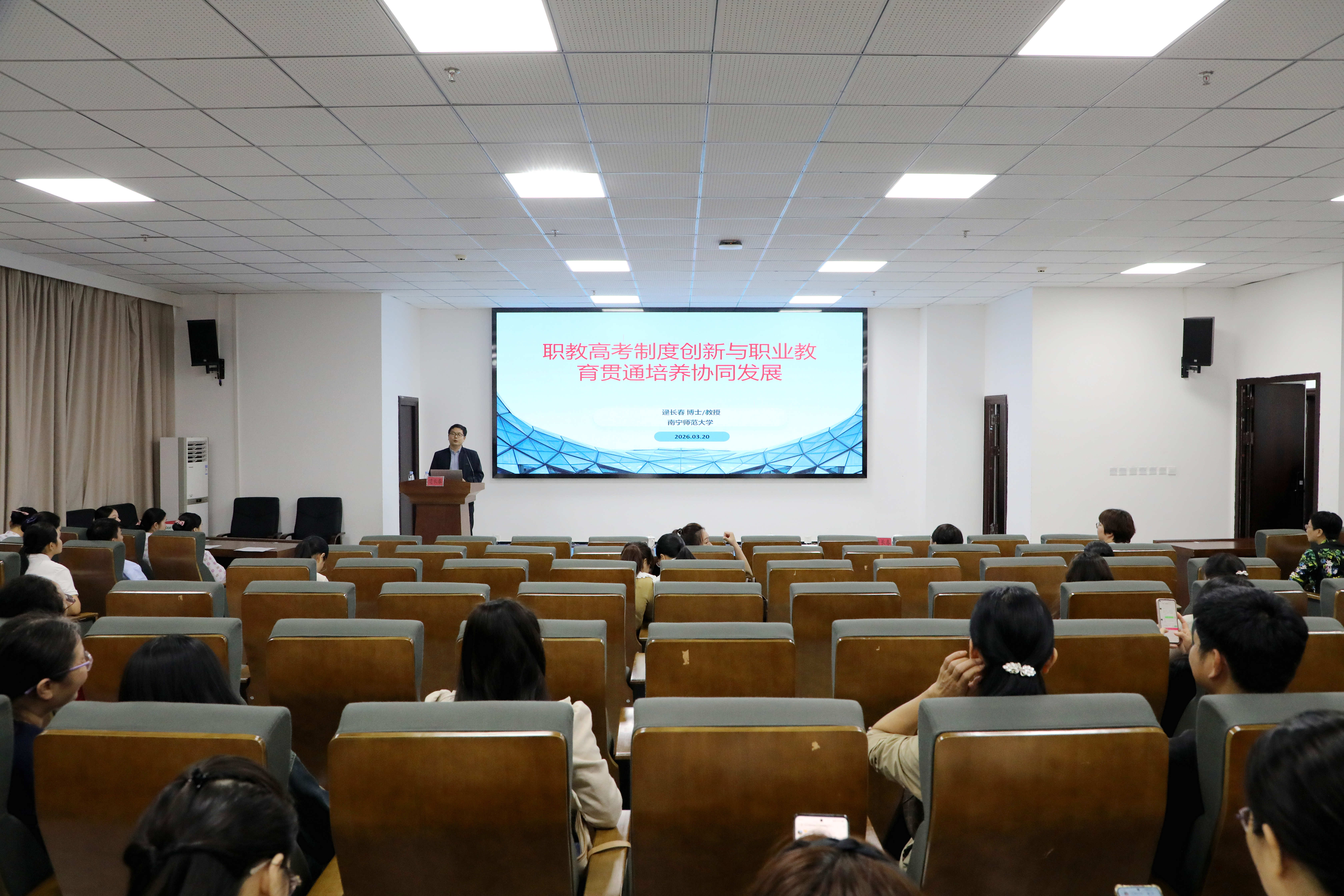 主会场上,柳州职业技术大学副校长陈正振教授作《教育强国视域下产教融合的现代职业教育体系》专题分享,为学校深化产教融合、推进职教本科建设提供了宝贵经验、清晰路径和重要启示。在大健康产教融合论坛和职业教育分论坛两个分会场上,自治区中医药局副局长庞清,自治区卫健委科教处副处长黄东明,玉林校区、附设玉林卫生学校校长赵婷婷,民政职业大学老年福祉学院院长屠其雷,广西师范大学职业技术师范学院副院长邓小华,南宁师范大学职业技术师范学院教授逯长春等专家学者围绕中医药产业产教融合发展、大健康领域三链融汇、人才培养、双优建设、职教高考等方面展开深入研讨,凝聚合作共识。