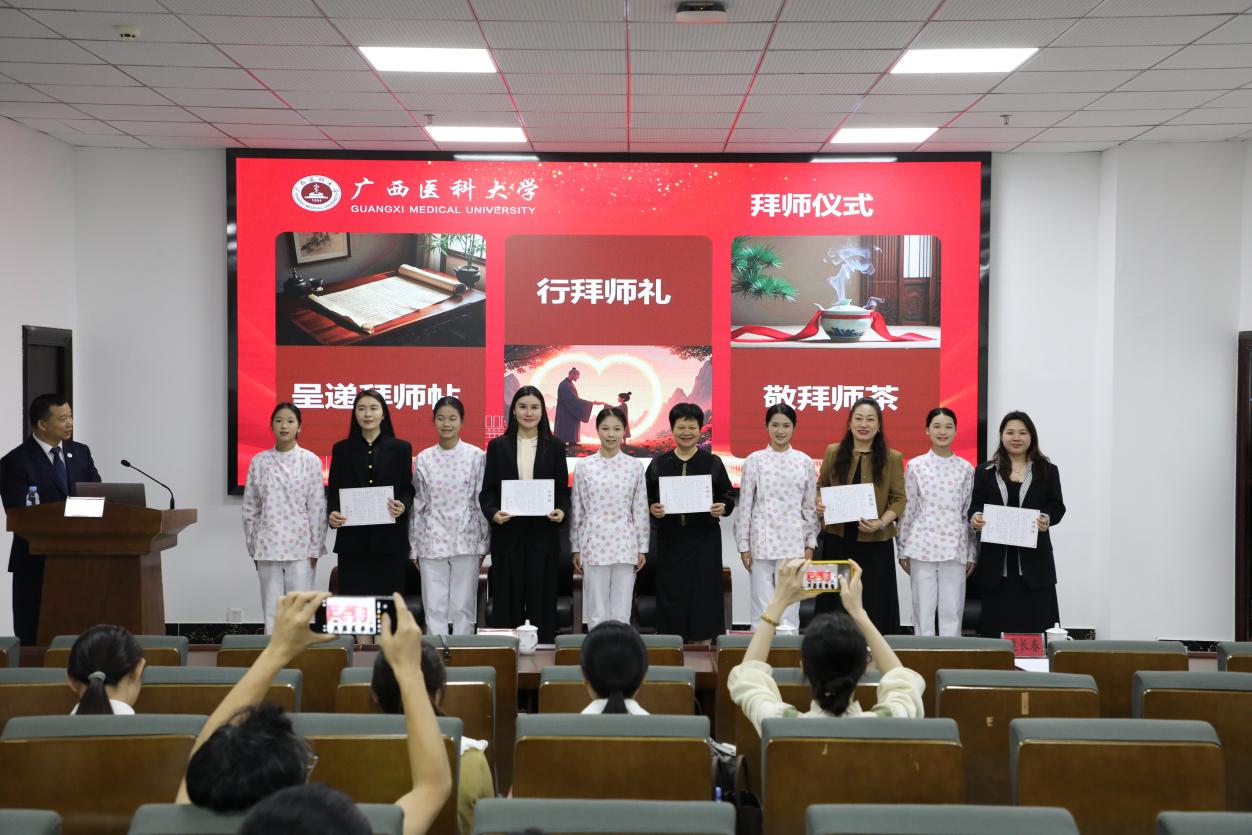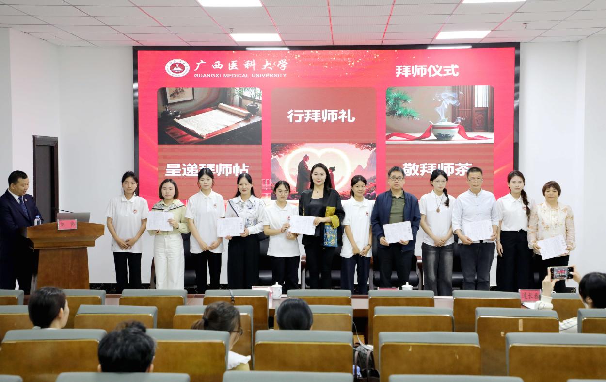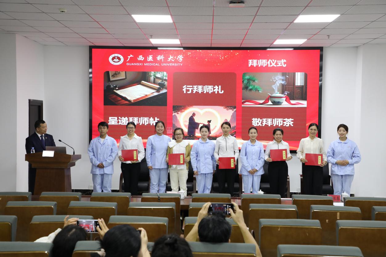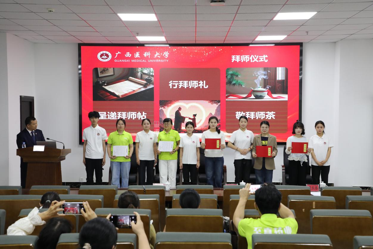 本次仪式覆盖婴幼儿托育、老年人服务与管理、中药与康复技术、美容及药学等多个专业,分四批进行。本次拜师活动有幸邀请到了广西医科大学第二附属医院康复科龙耀斌主任、广西医科大学莫洁玲教授、广西吉郦婴幼儿托育服务有限公司梁永欣董事长及广西南宁市壮贝康复服务有限公司、广西大参林医药有限公司、广西旭欢堂医药有限公司、玉林市至真药业连锁有限责任公司等21名行业精英,导师与学徒现场结对,通过呈递拜师帖、行拜师礼、敬茶等传统仪式,正式确立师徒关系。刘伟在介绍导师时表示,企业导师将成为学生职业生涯中最宝贵的引路人,期待师徒携手传承匠心。