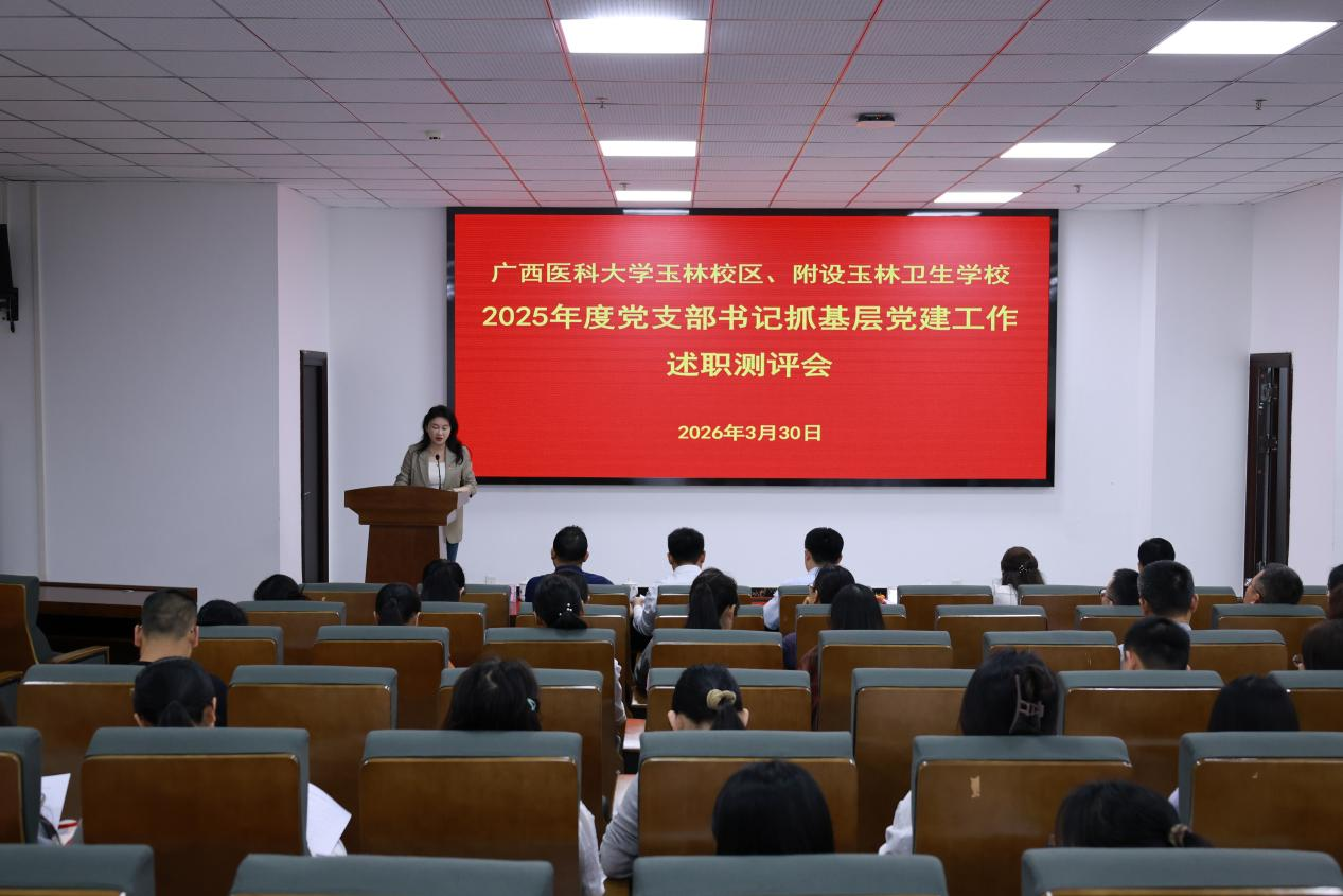 2026年3月30日下午,玉林校区召开2025年度党支部书记抓基层党建工作述职评议会。学校党委组织部副部长张孟见列席指导,玉林校区党委副书记、校长赵婷婷主持会议,校区领导班子及师生代表50余人参会。